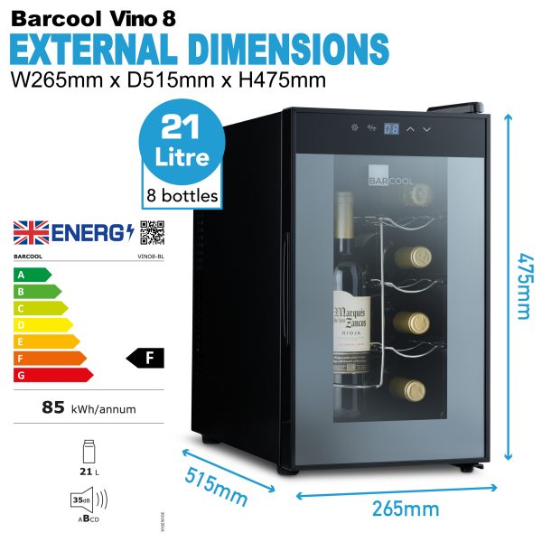 Barcool VINO 8 LED is a high-quality 21L modern and contemporary designed tabletop wine display fridge. This advanced compressor-driven wine cooler is fully automatic, practical and versatile to your needs. 3°C to 18°C (+/- 2°C).