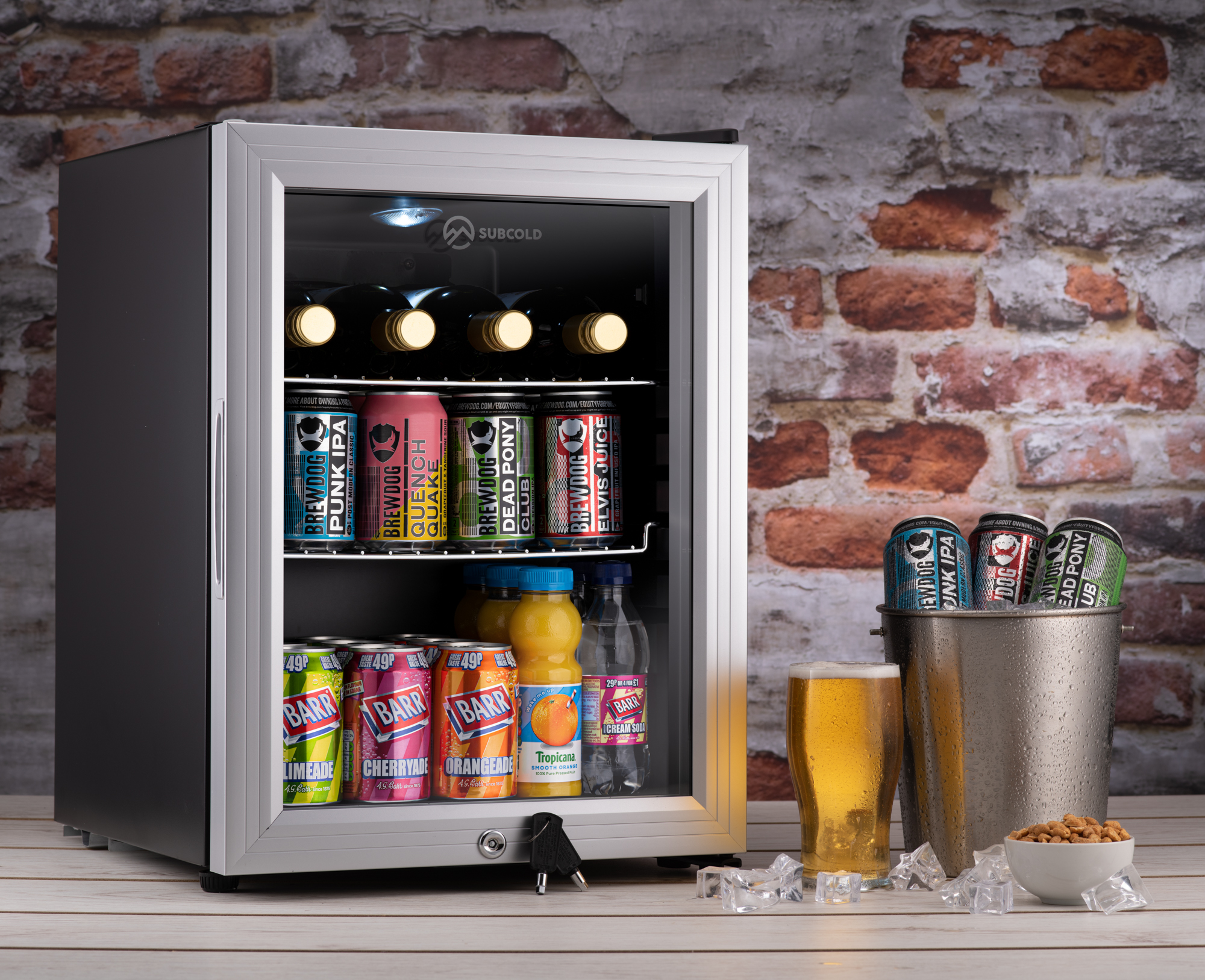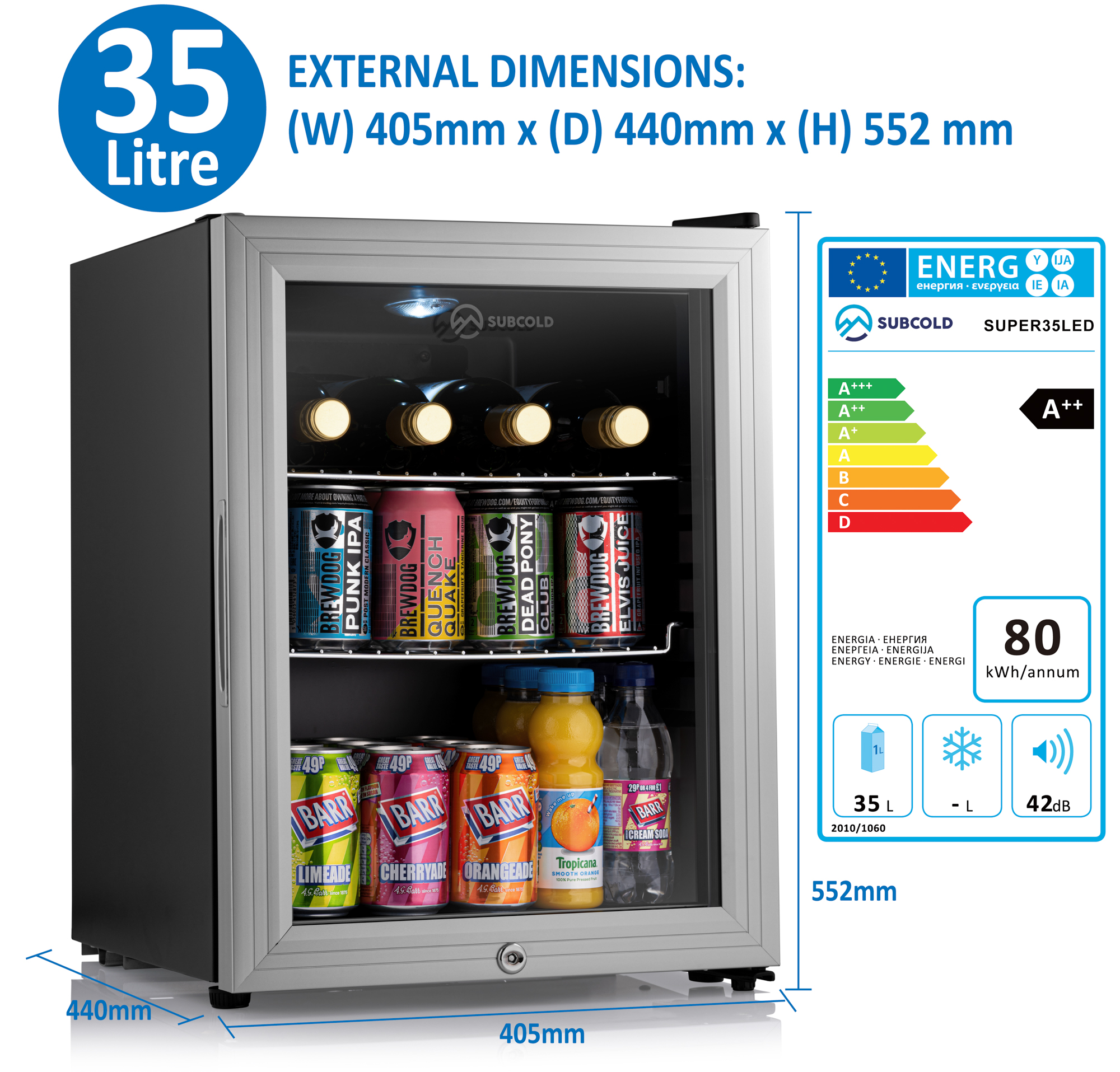 The Subcold Super 35 LED is a high quality beer fridge with a silver colour door and a storage capacity of 35 litres. It is a modern and contemporary designed drinks fridge perfect for cooling beers, cans, bottles, snacks and drinks. The fridge is equipped with advanced compressor cooling technology making it fully automatic, practical and versatile to your needs. There is an adjustable thermostat giving you a temperature range of 3-18°C (+/- 2°C).