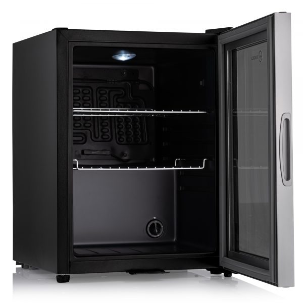 This compact model measures 404W x 424D x 552H (mm) with a weight of only 15.6 kg. The light weight of this fridge makes it easier for you to move it around wherever you need to. The fridge features a high grade dual glazed glass door with LED light to illuminate all your snacks and drinks inside.
