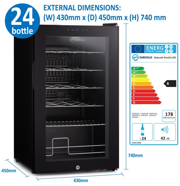 The Subcold VIVA24 LED is tastefully designed wine cooler for modern living. It is a freestanding display wine fridge storage capacity of 70 litre which can easily store up to 24 standard (75cl) wine bottles. This advanced compressor driven wine cooler is fully automatic, practical and versatile to your needs. The fridge is equipped with digital thermostat giving you a range of 3°C to 18°C (+/- 2°C).